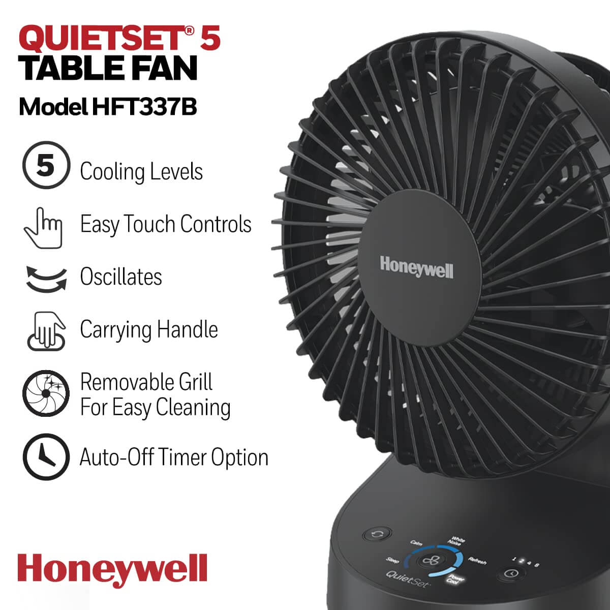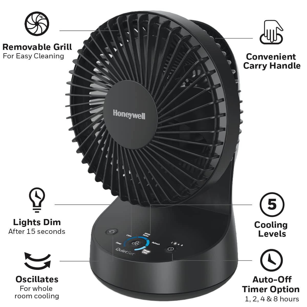 Honeywell QuietSet® 5 borðviftan er afar þægileg og hentar minni herbergjum hvort heldur sem er á skrifborð, náttborð eða kommóðuna. Ígreipt handfang sem auðveldar færslu á milli staða. Hún kemur samsett og tilbúin til notkunar.