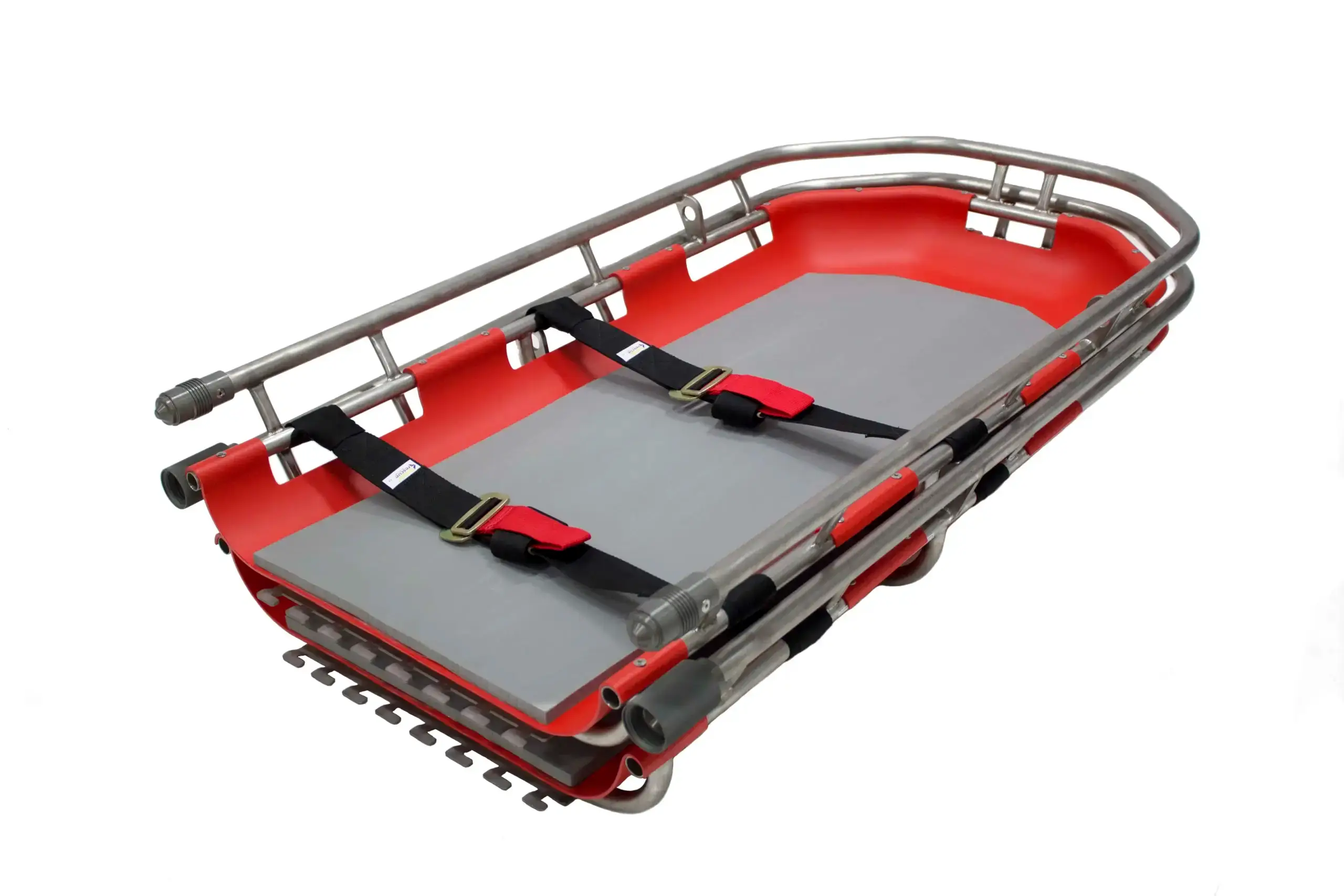 The unique Split-Apart feature allows for a completely secure connection between the parts of the rescue litter, without the use of pins or tubes sliding into each other. The LocSafe feature allows for quick and easy visual check to ensure connections are secure throughout an operation. A small button stops split apart co-nection from being disengaged during the rescue process.
