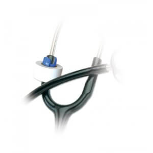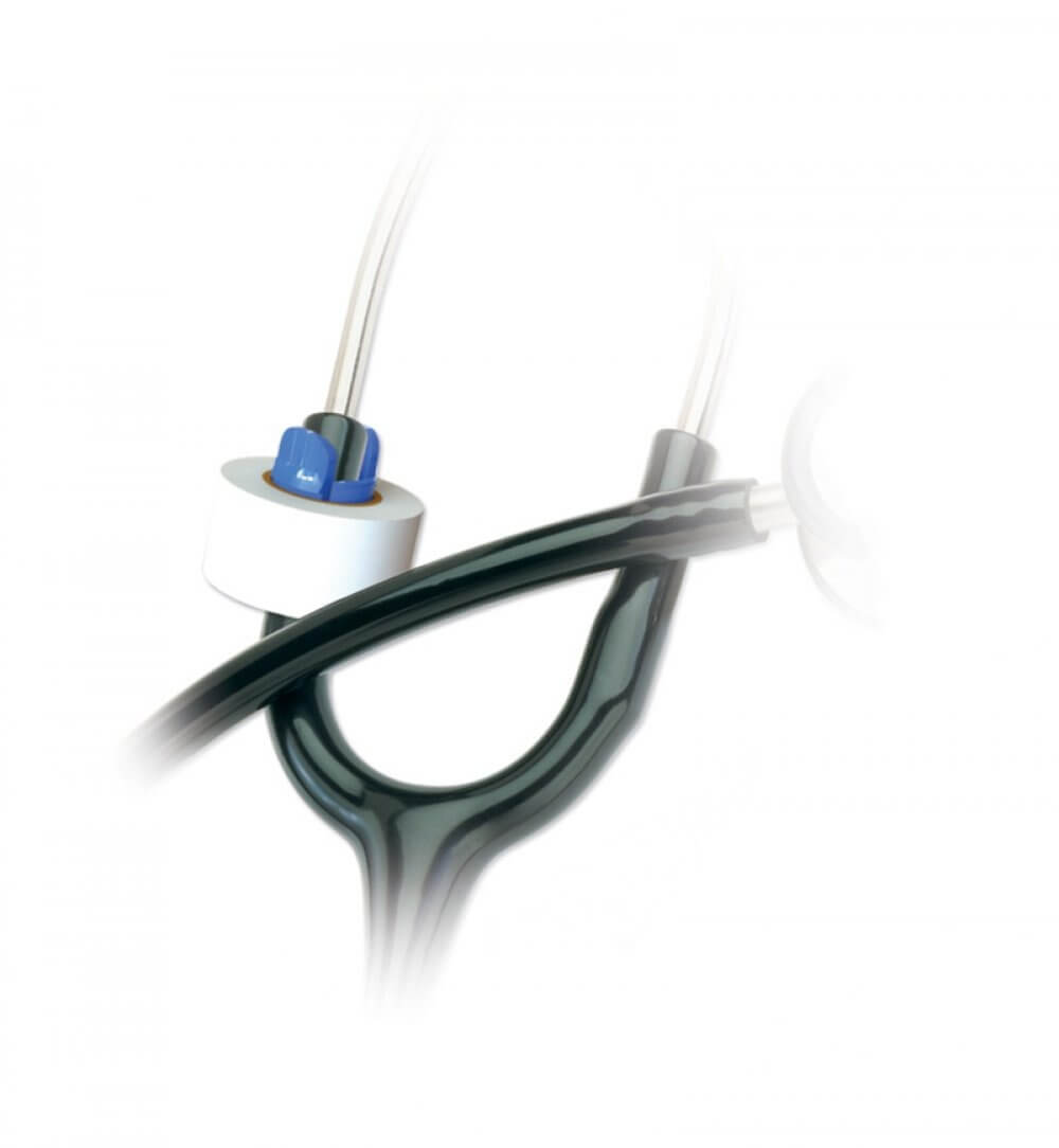 A unique tape holder designed to keep medical tape secure to any stethoscope and ready for use.