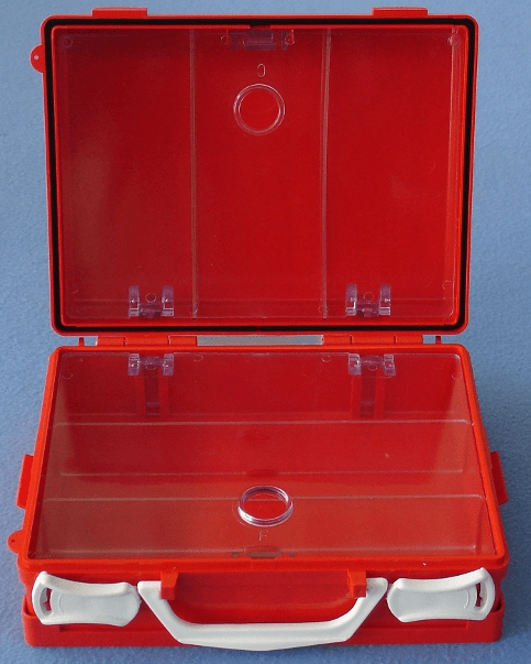 SuperMedi sjúkrakassinn kemur tómur með veggfestingu. Þegar hann er opnaður þá koma í ljós 2 stór hólf. Yfir hverju hólfi er glær skilrúm til að gera það mögulegt að skoða innihaldið. Hverju hólfi fyrir sig er hægt að skipta enn frekar niður með meðfylgjandi innri plötum. Hægt er að opna hann án þess að losa hann úr veggfestingunni og nota skilrúmið sem vinnuborð. Til þess að það sé hægt þá eru meðfylgjandi stopparar renndir í raufar undir kassanum til að hann opnist í 90°. Með þessu ætti innihaldið síður að falla úr.
