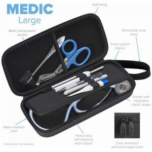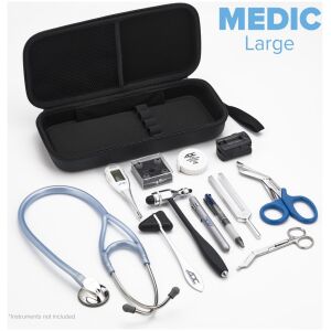 Þetta sterklega veski er sérstaklega hannað fyrir lækningaáhöld t.d. hlustunarpípur, hamarinn, manual blóðþrýstingsmæla, pennaljós, skæri o.fl. Frábært að hafa allt á sínum stað og varið fyrir skemmdum eða sliti.